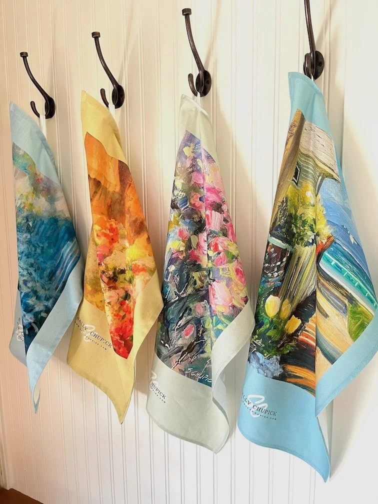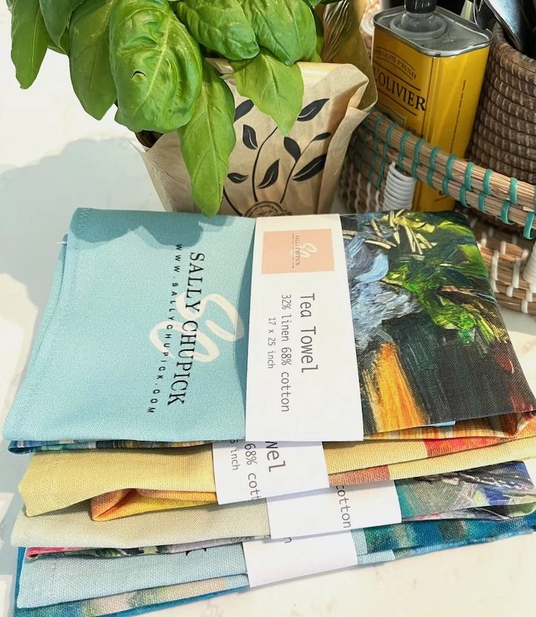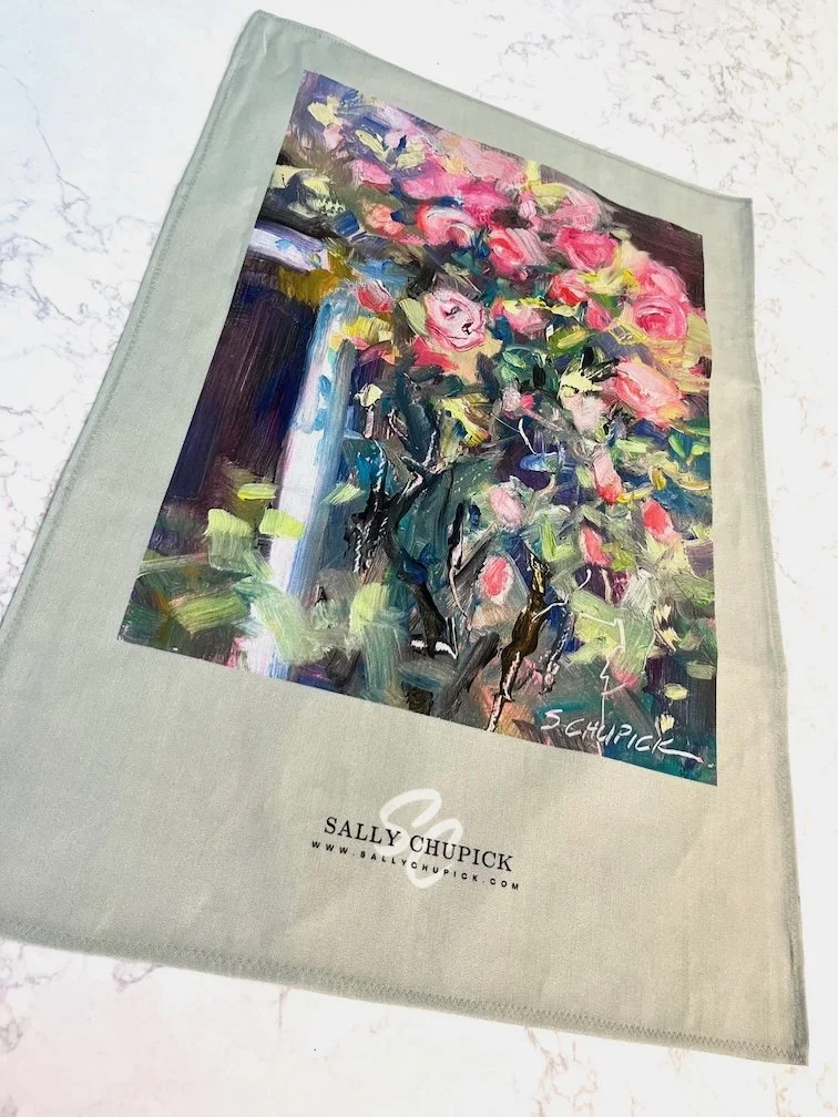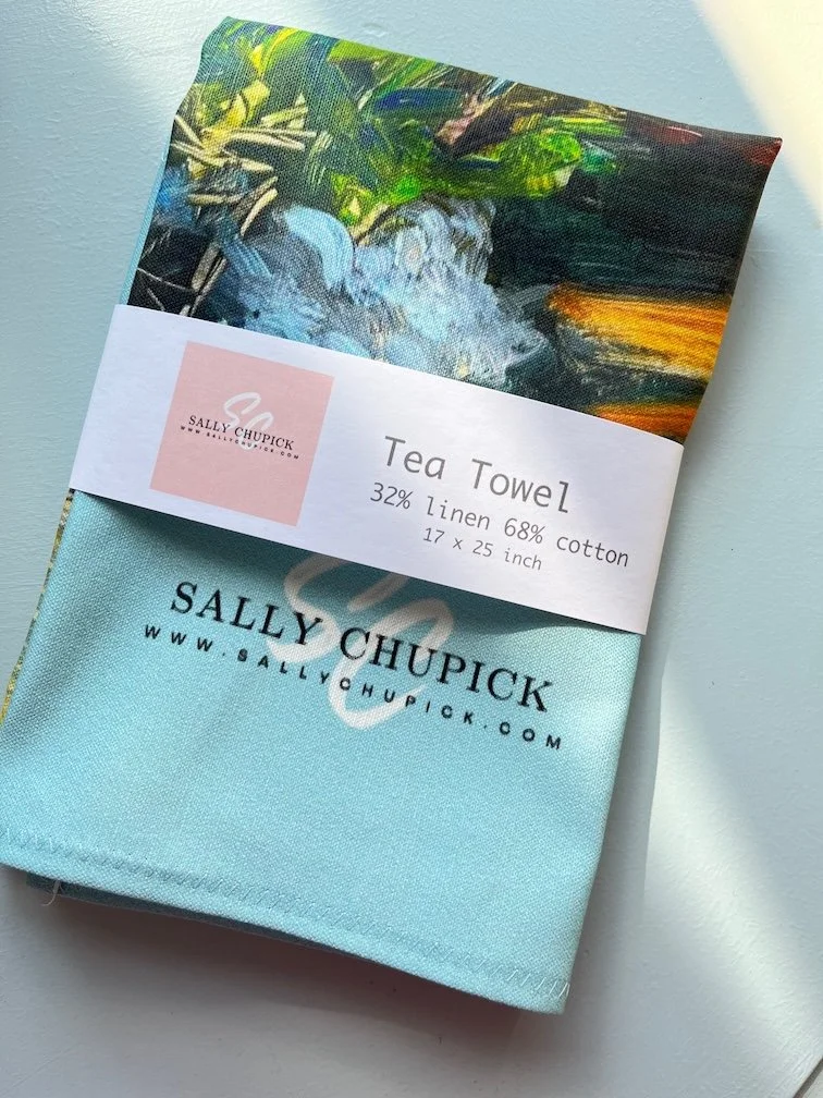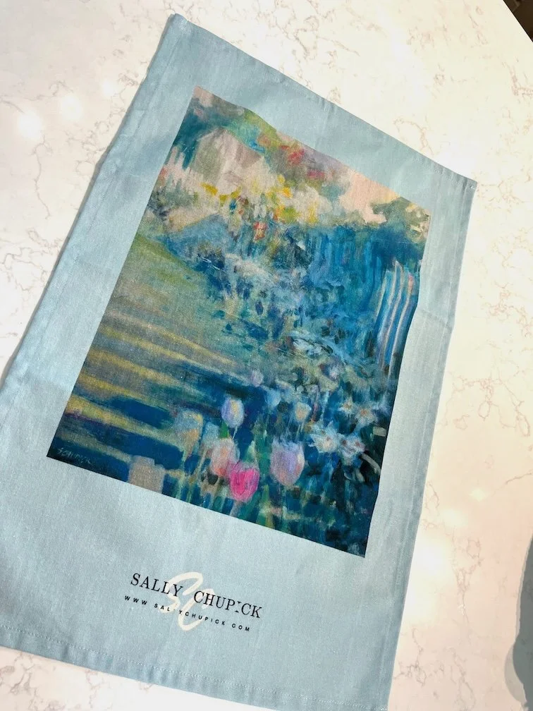 ART GIFTS Stickersheet, Vancouver Island Minis variety of Stickers $10.00 'Tumbling Roses' by Sally Chupick, quilted, zippered, cosmetic bag, $45.00 Himalayan Blues, Printed Cosmetic Bag by Sally Chupick $45.00 Linen/Cotton Tea Towel by Sally Chupick, choose from 4 designs $39.00