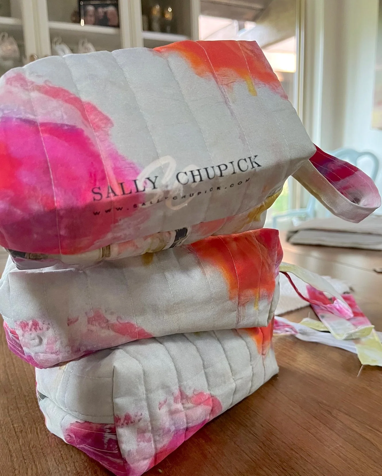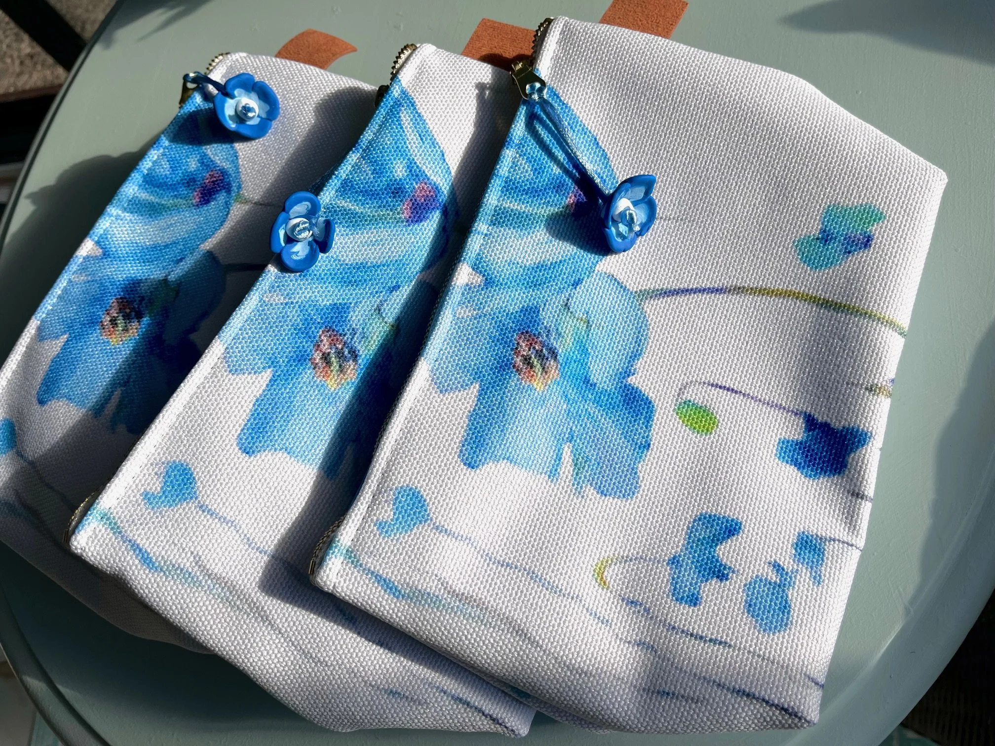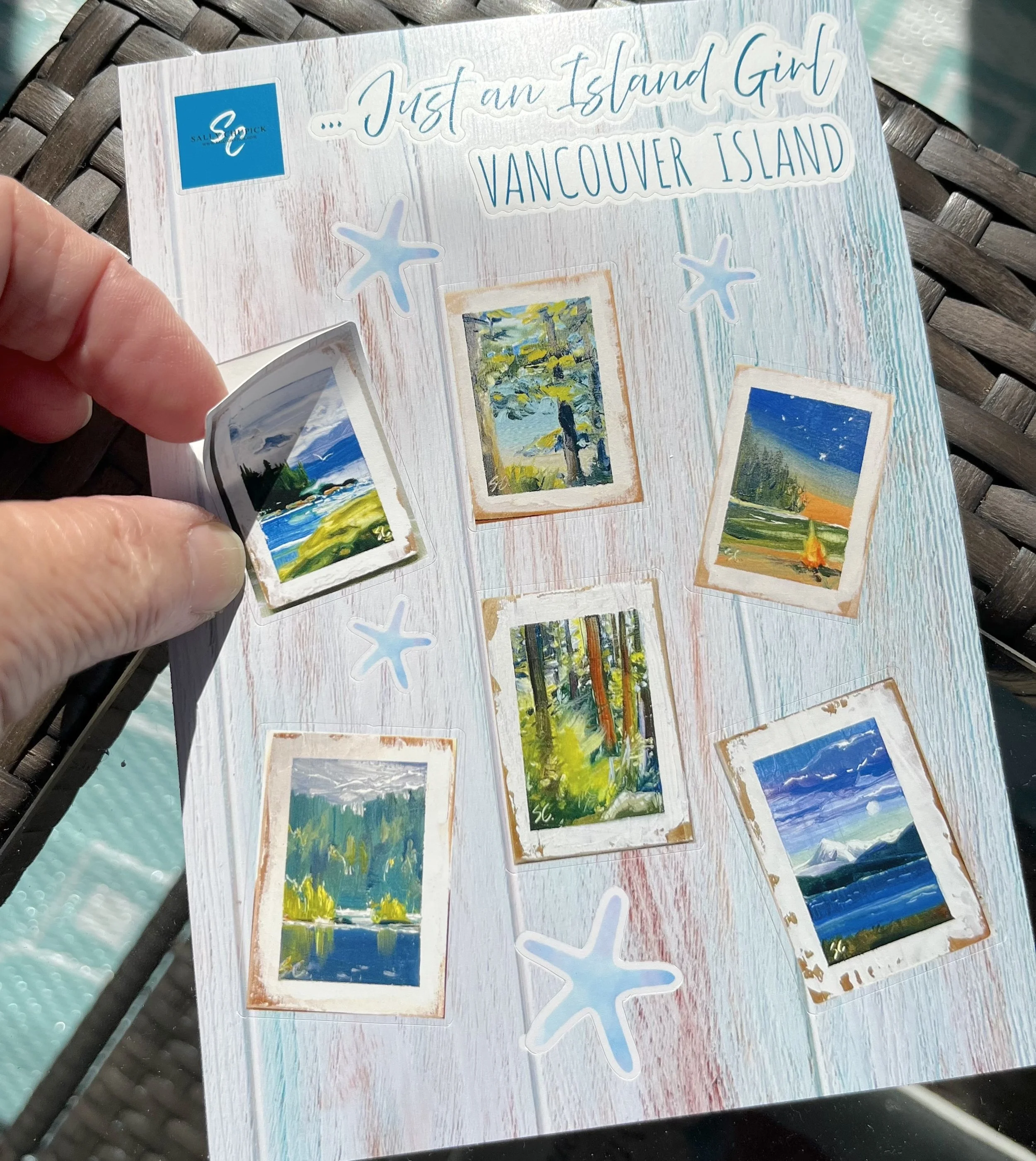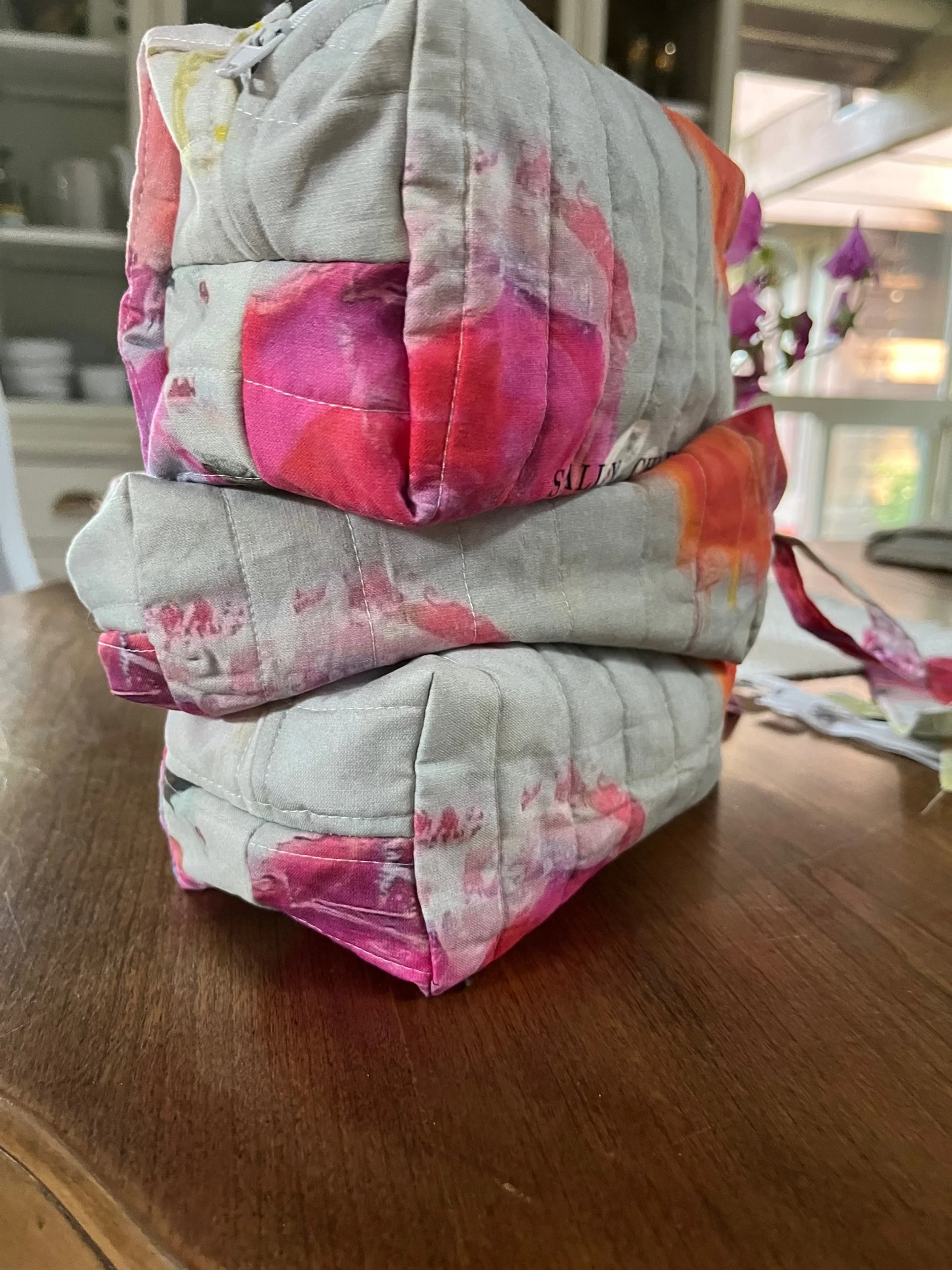 ART GIFTS Stickersheet, Vancouver Island Minis variety of Stickers $10.00 'Tumbling Roses' by Sally Chupick, quilted, zippered, cosmetic bag, $45.00 Himalayan Blues, Printed Cosmetic Bag by Sally Chupick $45.00 Linen/Cotton Tea Towel by Sally Chupick, choose from 4 designs $39.00