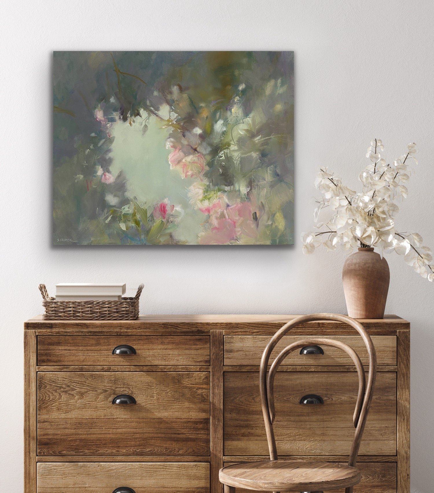 Naturally is a 30x24 inch oil on canvas semi abstract botanical oil painting by Sally Chupick. It is unframed and ready to hang. The sides are painted a neutral grey.